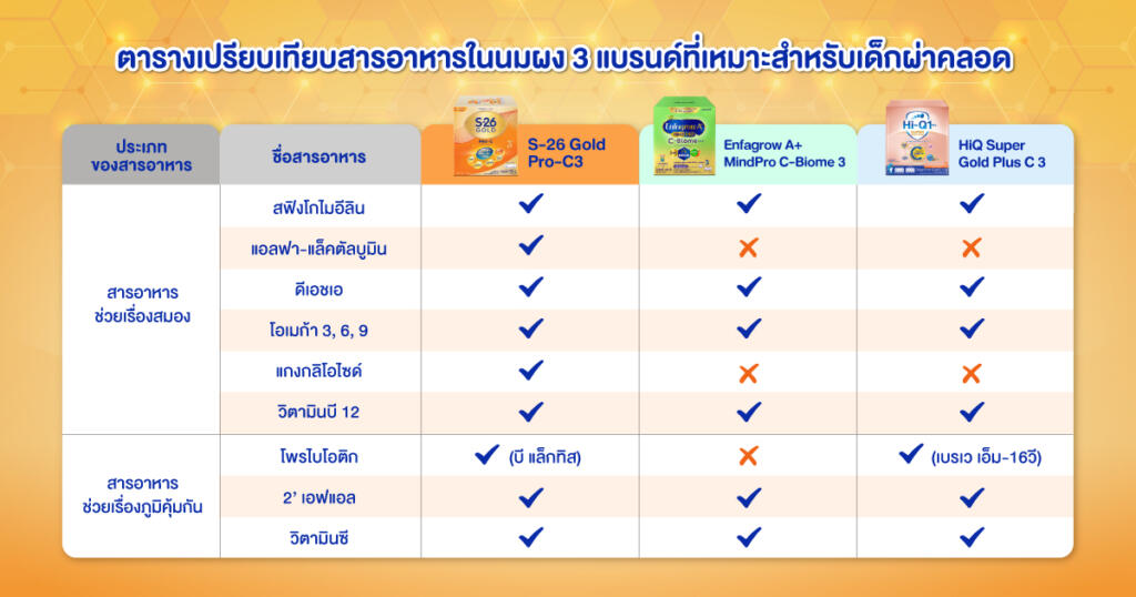 มาเจาะลึกกันเลยค่ะว่า นมผงสำหรับเด็กผ่าคลอดทั้ง 3 แบรนด์ดังที่เราคัดมา มีสารอาหารสำคัญอะไรที่โดดเด่น และช่วยเสริมสร้างพัฒนาการสมอง รวมถึงภูมิคุ้มกันให้ลูกรักได้อย่างเต็มที่ค่ะ