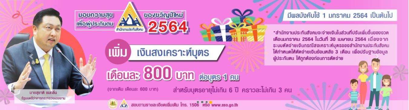 จากข่าวเดือน มกราคม ต้นปี 64 สำนักงานประกันสังคม ได้ประกาศกฎกระทรวง เปิดเผยถึงการปรับเพิ่มเงินสงเคราะห์บุตร ให้กับบุตรของผู้ประกันตนประกันสังคม ที่มีอายุตั้งแต่แรกเกิดจนถึง 6 ปี ให้มีสิทธิ์ได้รับเงินเพิ่มจากเดิมเดือนละ 600 บาท เป็นเดือนละ 800 บาทต่อคน โดยจ่ายคราวละไม่เกิน 3 คน ซึ่งมีผลบังคับใช้ตั้งแต่วันที่ 1 มกราคม 2564 เป็นต้นไป