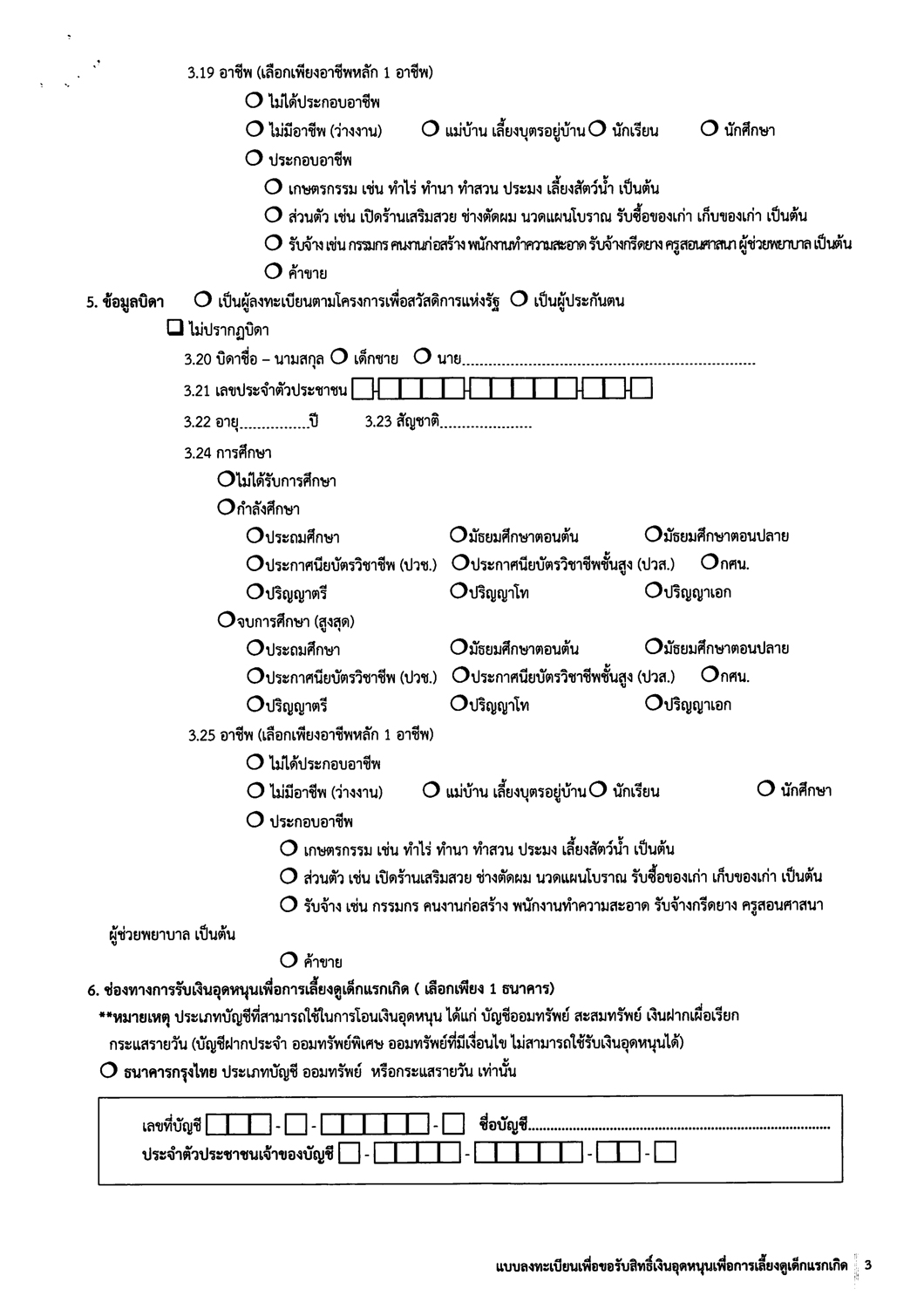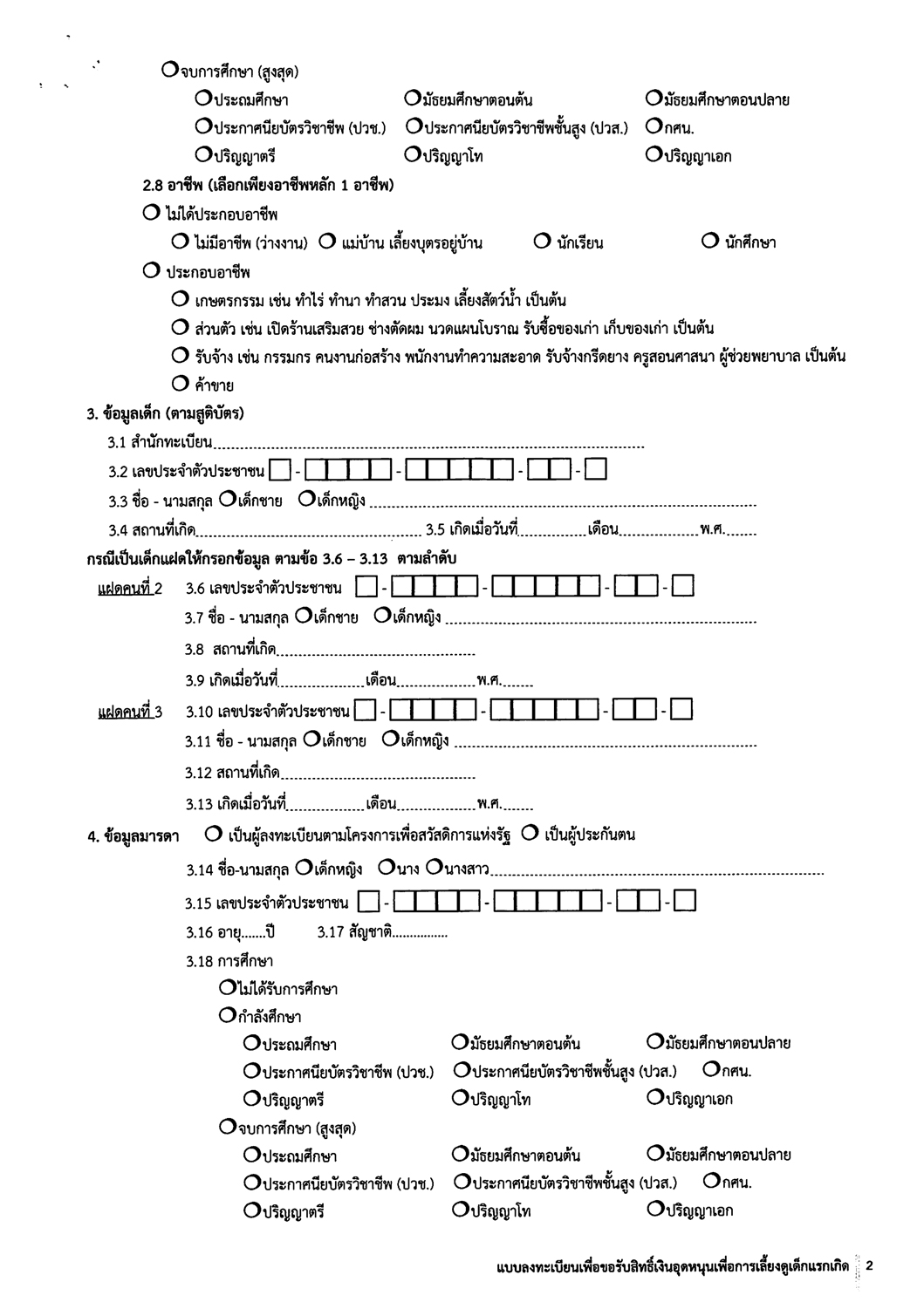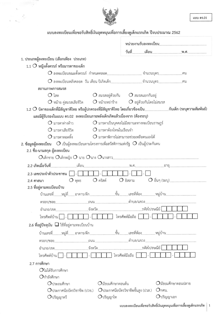 ดาวน์โหลด >> แบบฟอร์มลงทะเบียนเพื่อขอรับสิทธิ์เงินอุดหนุนเพื่อการเลี้ยงดูเด็กแรกเกิด