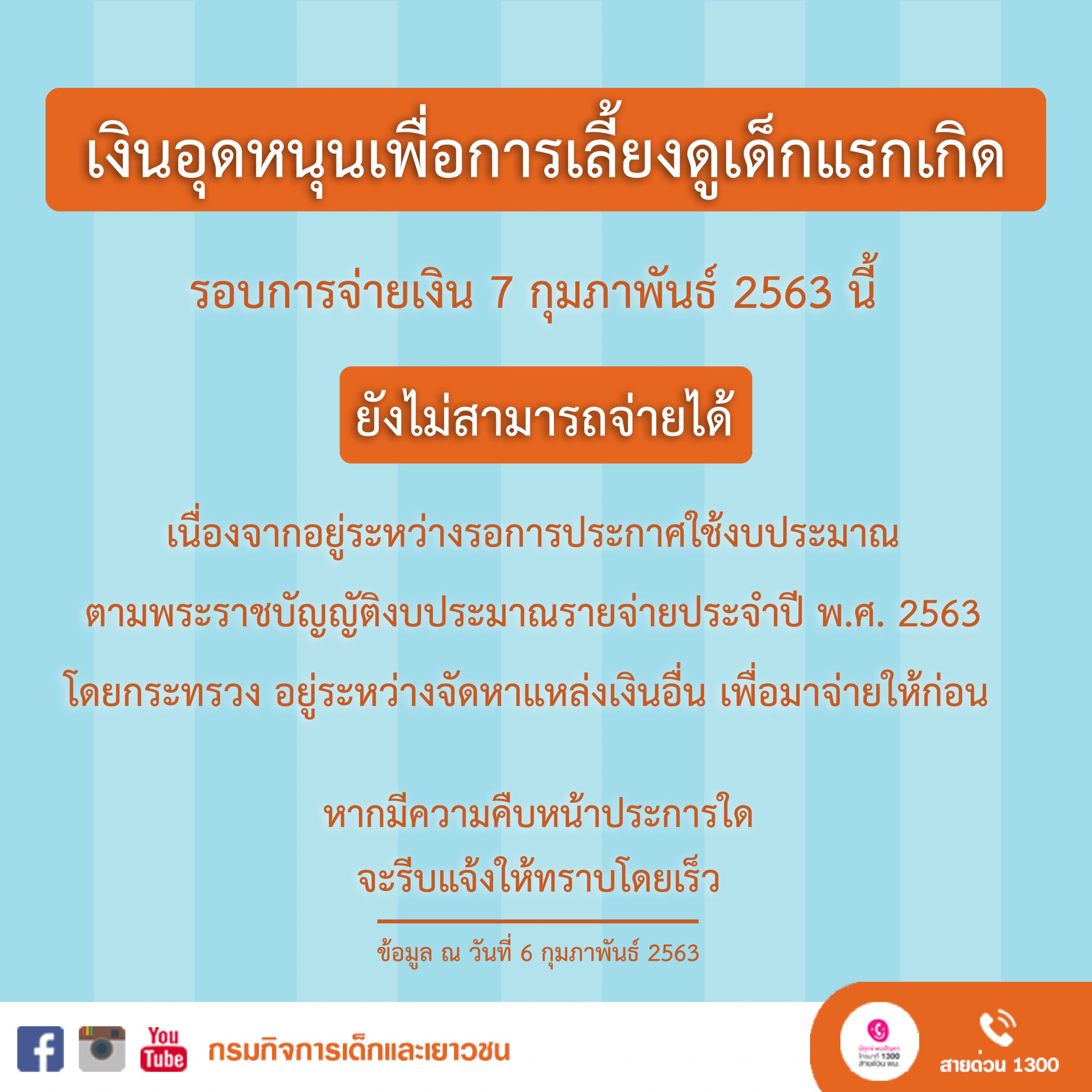 เมื่อวันที่ 6 กุมภาพันธ์ 2563 ที่ผ่านมา มีการประกาศเรื่องเงินอุดหนุนเพื่อการเลี้ยงดูเด็กแรกเกิด ระบุว่า เงินอุดหนุนเพื่อการเลี้ยงดูเด็กแรกเกิด รอบการจ่ายเงิน 7 กุมภาพันธ์ 2563 นี้ ยังไม่สามารถจ่ายได้ เนื่องจากอยู่ระหว่างรอการประกาศใช้งบประมาณ ตามพระราชบัญญัติงบประมาณรายจ่ายประจำปี พ.ศ. 2563 โดยกระทรวง อยู่ระหว่างจัดหาแหล่งเงินอื่น เพื่อมาจ่ายให้ก่อน หากมีความคืบหน้าประการใด จะรีบแจ้งโดยเร็ว