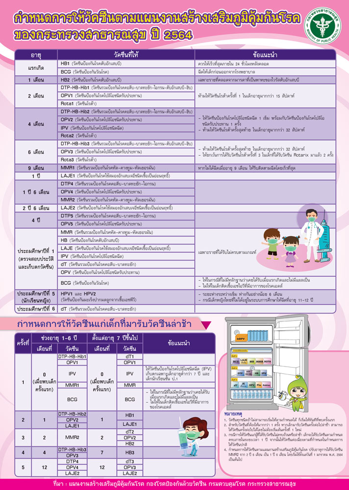 สำหรับกำหนดการให้วัคซีนตามแผนงานสร้างเสริมภูมิคุ้มกันโรค ของกระทรวงสาธารณสุข ตารางวัคซีน ปี 2564 ทางกระทรวงสาธารณสุขได้จัดให้มีการบริการวัคซีนขั้นพื้นฐานเพื่อสร้างเสริมภูมิคุ้มกันโรคแก่เด็ก กลุ่มเป้าหมายที่อาศัยอยู่ในประเทศไทยทุกคนทั้งเด็กไทยและต่างชาติ สําหรับโรคที่ป้องกันได้ด้วยวัคซีนที่ให้บริการมี 12 โรค ได้แก่