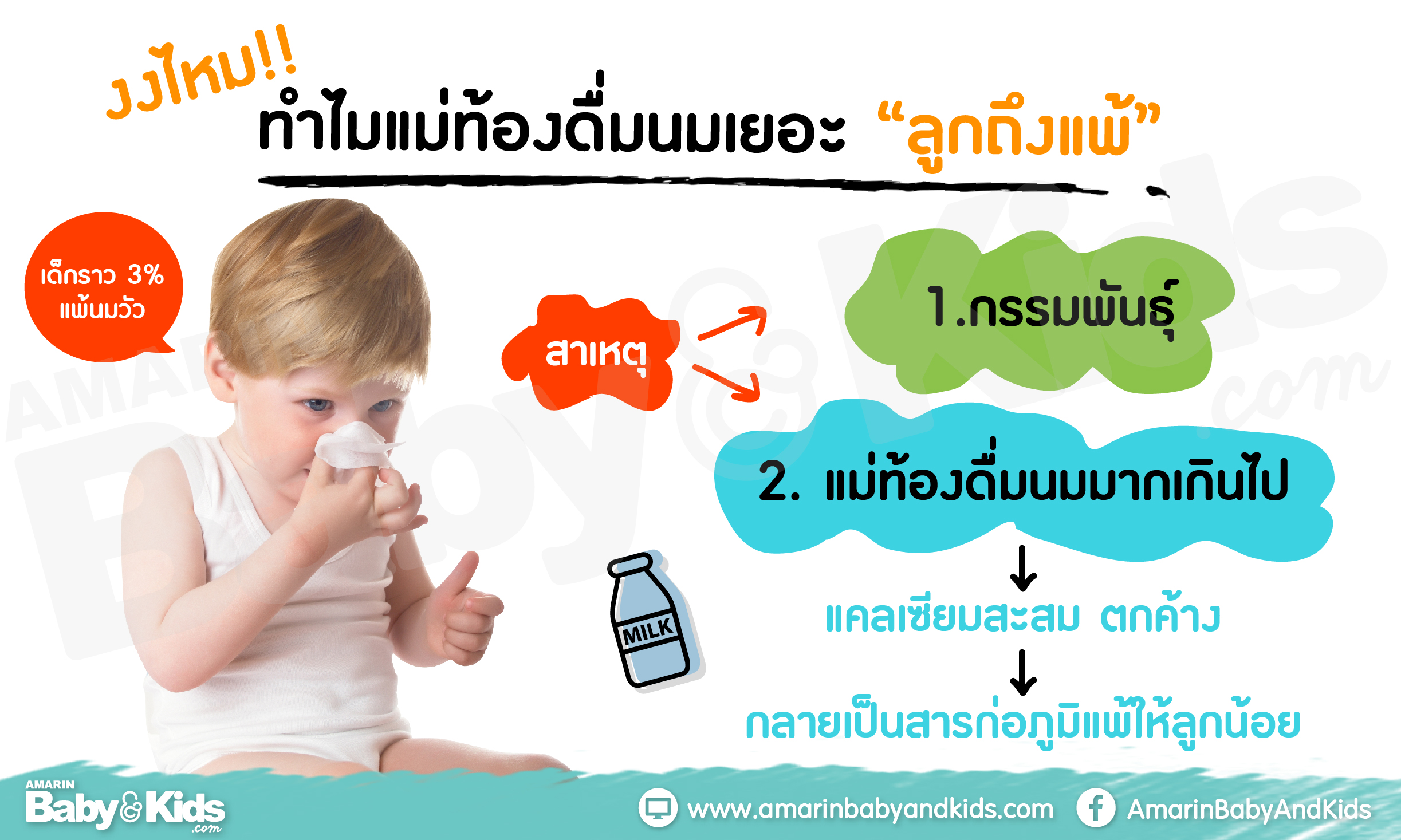 หากแม่ท้องบริโภคนมวัวหรือผลิตภัณฑ์จากนมวัวมากเกินไป จะทำให้เกิดการสะสมของแคลเซียมและโปรตีนนมวัว ซึ่งเป็นหนึ่งในสารก่อภูมิแพ้ที่ส่งผลกับลูกน้อยในครรภ์โดยตรง ทำให้ระบบภูมิคุ้มกันทำงานผิดปกติ และเข้าใจว่าโปรตีนจากนมเป็นสิ่งแปลกปลอม จึงกระตุ้นการผลิตสารแอนตี้บอดี้ชนิด Immunoglobulin E ขึ้นมา เมื่อคลอดแล้วลูกได้รับนมวัวระบบแอนตี้บอดี้นี้จะปล่อยสารฮีสทามีนออกมา จนปรากฎเป็นอาการแพ้ในลักษณะแตกต่างกัน ได้แก่