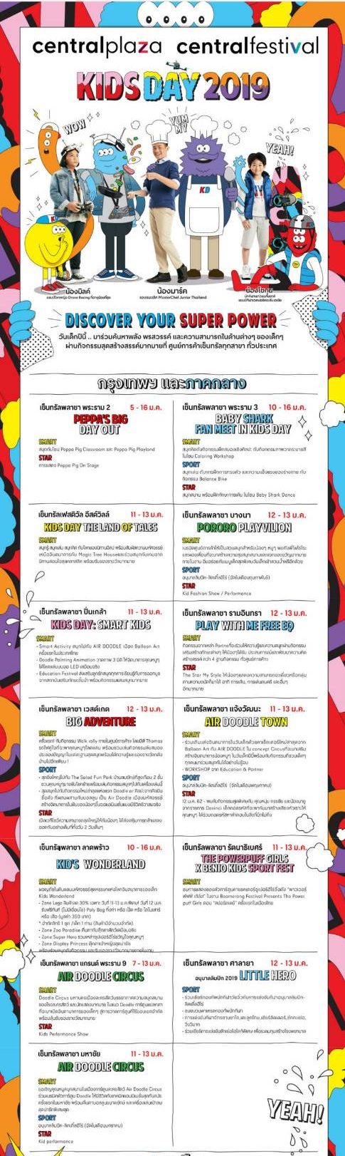 วันเด็กปีนี้ศูนย์การค้าเซ็นทรัลทุกสาขา ได้จัดกิจกรรมไว้ให้เด็กๆ มาร่วมสนุกกันมายมายภายใต้ชื่อ “Kids Day 2019 – Discover Your Super Power” พร้อมพบเหล่าคาแรคเตอร์ตัวการ์ตูนขวัญใจคุณหนูๆ และกิจกรรมพัฒนาทักษะ และศักยภาพที่เด็กๆ ซ่อนอยู่ในตัวเองให้ฉายแววออกมาด้วย!