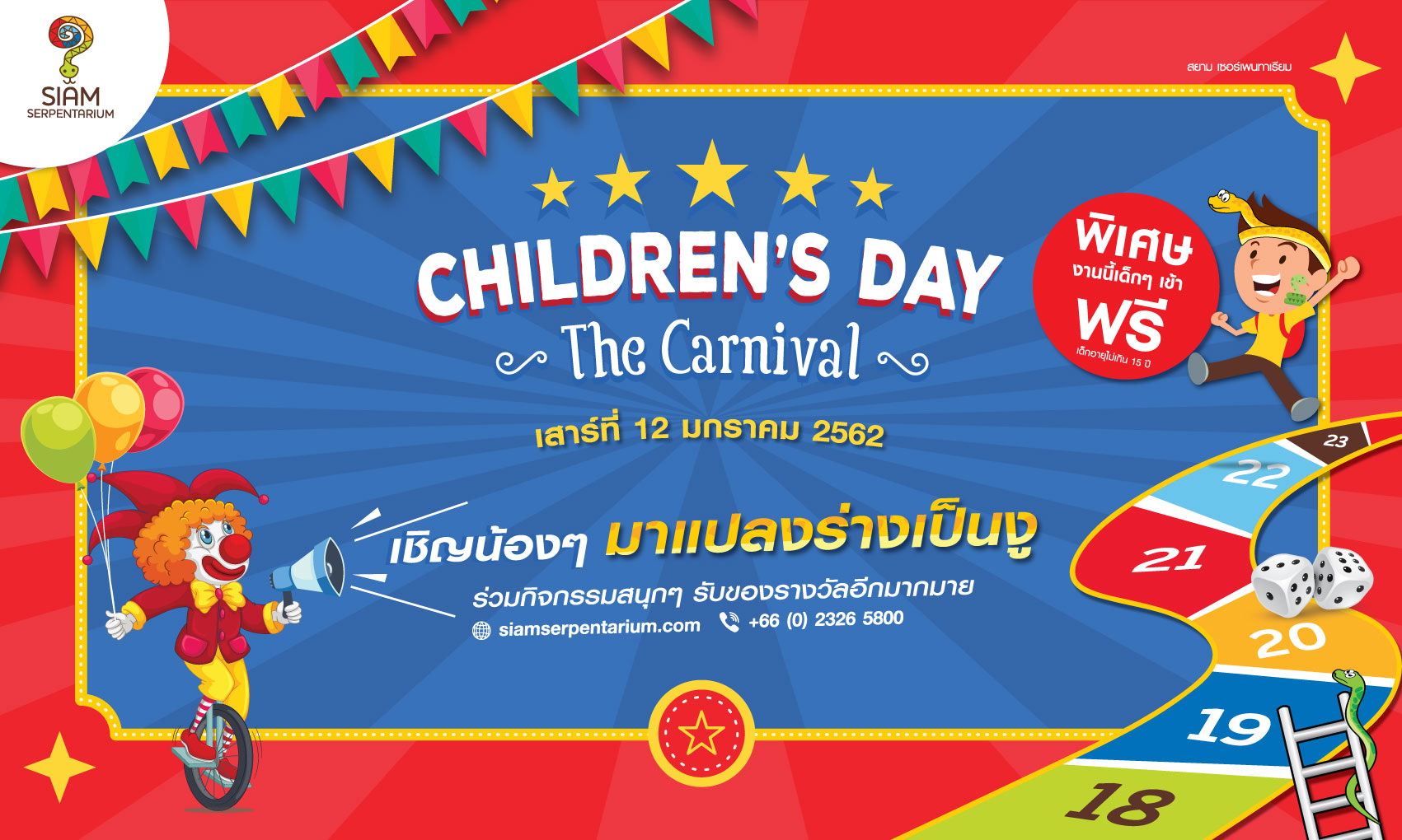 ศูนย์การเรียนรู้และพิพิธภัณฑ์งูรูปแบบ interactive ที่ให้ความรู้คู่ความบันเทิงแห่งแรกในเอเชีย จัดกิจกรรม “Children’s Day The Carnival @ Siam Serpentarium” ชวนน้องๆ บุกตะลุยเข้าไปในโลกแห่งงู พร้อมร่วมสนุกกับกิจกรรมสุดพิเศษ Face & Body Paint แปลงร่างเป็นงู พลาดไม่ได้กับเกมบันไดงูยักษ์ที่มีของรางวัลให้น้องๆ ได้ร่วมลุ้นมากมาย และสนุกไปกับพี่โบโซ่ที่ขนลูกโป่งแสนสวยมาสร้างสีสันภายในงาน พิเศษสุด! สำหรับเด็กที่มีอายุไม่เกิน 15 ปี เข้าฟรี!! พร้อมรับสิทธิ์ร่วมกิจกรรมและรับของที่ระลึกสุดพิเศษ