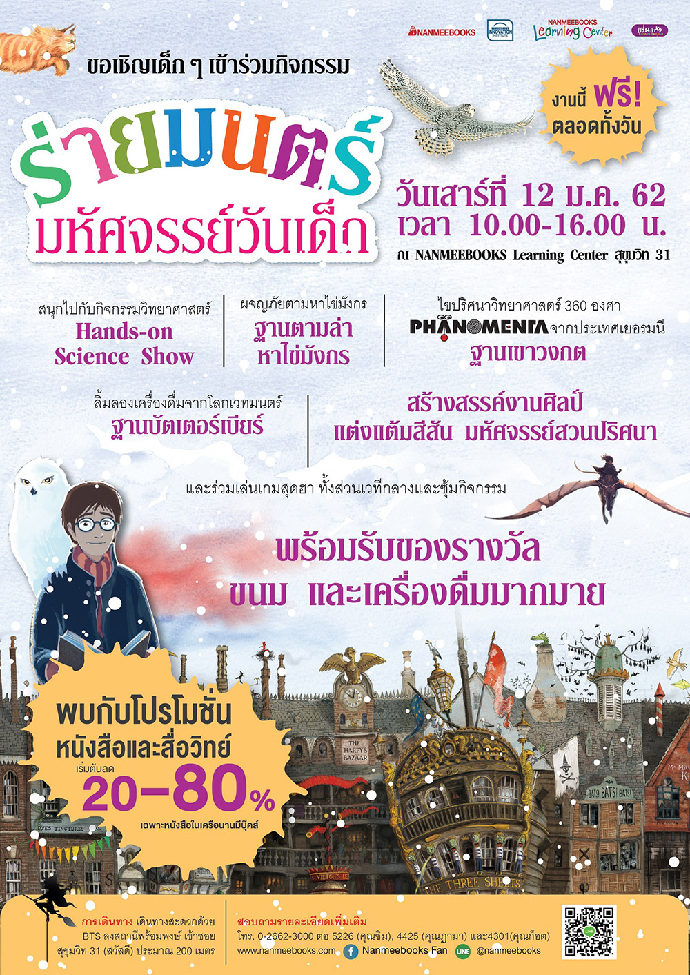 และพบกับ Hands-on Science Show ที่จะทำให้น้อง ๆ ได้ร้อง WOW!!! พร้อมเปิดเวทีสำหรับน้อง ๆ เพื่อมาแสดงความสามารถกันอีกด้วย สนุกได้ความรู้ ของรางวัล ขนม เครื่องดื่มพร้อม มากมาย งานนี้กิจกรรมฟรีตลอดทั้งงาน แถมด้วยโปรโมชั่นสุดพิเศษซื้อหนังสือภายในงานลดสูงสุด 80%!!! พบกันวันเสาร์ที่ 12 มกราคม 2562 เวลา 10.00 – 16.00 น ณ Nanmeebooks Learning Center สุขุมวิท 31สนใจติดต่อสอบถามรายละเอียดได้ที่ โทร. 02-662-3000 ต่อ 5226