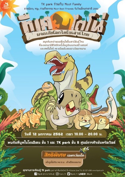 อุทยานการเรียนรู้ TK park จัดกิจกรรมรับวันเด็กแห่งชาติชวนเด็กๆ มาร่วมย้อนเวลาทะลุมิติไปกับ “ทีเคไดโน่ ผจญภัยโลกไดโนเสาร์ไทย” สนุกกับเหล่าผองเพื่อนไดโนเสาร์สายพันธุ์ไทยกว่า 14 สายพันธุ์จากยุคดึกดำบรรพ์ที่สูญพันธุ์ไปแล้วหลายล้านปีจะกลับมามีชีวิตอีกครั้งให้เด็กๆ ได้ทำความรู้จักและสนุกไปกับการเรียนรู้ผ่านเกมสร้างสรรค์และแอพพลิเคชั่น TK AR ชมกิจกรรมแสดงความสามารถของเยาวชนคนเก่ง ทั้งร้องเล่น เต้น รำ เล่านิทาน ร่วมสนุกกับเกมลูกโป่งจากพี่โบโซ่ใจดี ที่จะมามอบความเฮฮารอยยิ้มและเสียงหัวเราะให้อบอวลตลอดงาน หรือจะร่วมออกสเต็ปเต้นให้สนุกไปกับผองเพื่อนไดโนเสาร์ และกิจกรรมอื่นๆ ที่เตรียมไว้สำหรับมอบความสุขให้กับเด็กๆ ตลอดทั้งวัน ในวันเสาร์ที่ 12 มกราคม นี้ เวลา 10.00-17.00 น. ที่ อุทยานการเรียนรู้ TK park ชั้น 8 เด็กสูงไม่เกิน 140 ซม. เข้าฟรีตลอดงาน และบูท TK park งาน MCOT มหัศจรรย์วันเด็ก 2562 ชั้น 1 ศูนย์การค้าเซ็นทรัลเวิลด์