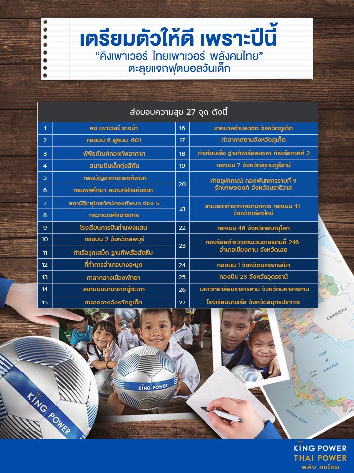 โดยน้อง ๆ ที่มีอายุระหว่าง 4-15 ปี สามารถรับลูกฟุตบอลได้คนละหนึ่งลูก ในวันเสาร์ที่ 12 มกราคม 2562 ตั้งแต่เวลา 08.00-15.00 น. หรือจนกว่าลูกฟุตบอลจะหมด สามารถติดตามรายละเอียดเพิ่มเติมได้ที่ เฟซบุ๊ก King Power Thai Power พลังคนไทย หรือเว็บไซต์ www.kingpowerthaipower.com โดยสามารถรับลูกฟุตบอลได้ตามสถานที่ ดังนี้