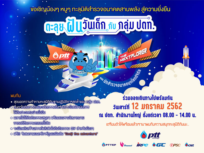 ขอเชิญน้องๆ ร่วมเป็นหนึ่งในขบวนการ สำรวจอนาคตสานพลัง สู่ความยั่งยืน ในงานตะลุยฝันวันเด็ก ประจำปี 2562 ตอน “นักสำรวจอนาคตบุกโลกดิจิทัล” พร้อมตื่นตาไปกับภารกิจและนวัตกรรมที่สร้างประโยชน์นานัปการให้กับประเทศอย่างยั่งยืน สนุกสนานกับกิจกรรมต่างๆ อาทิ กิจกรรม DIY ชมการ์ตูนแอนิเมชั่น ก๊อดจิ ดิ แอดเวนเจอร์ พร้อมลุ้นรับของรางวัลมากมาย เสาร์ที่ 12 ม.ค. 2562 นี้ ณ อาคาร ปตท. สำนักงานใหญ่ ถ. วิภาวดีรังสิต เวลา 8.00 – 14.00 น.