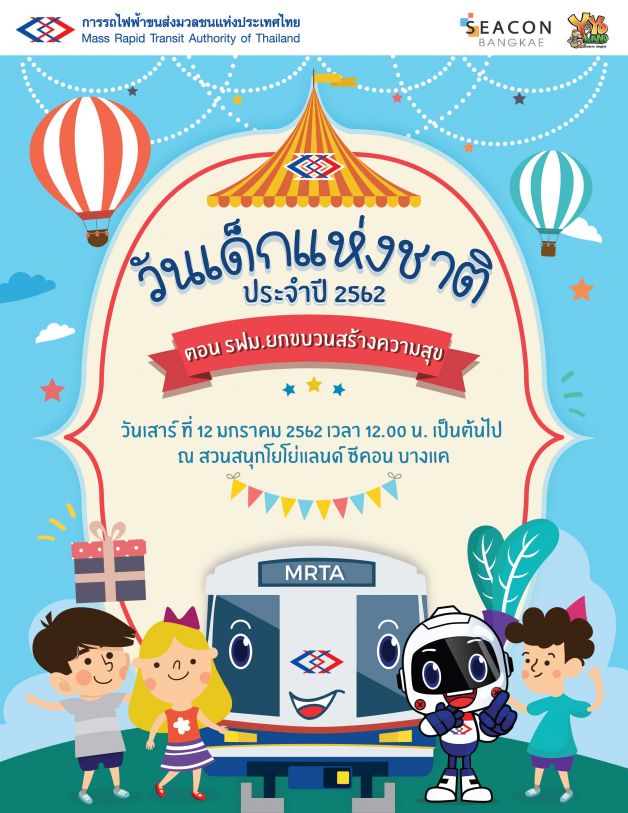 การรถไฟฟ้าขนส่งมวลชนแห่งประเทศไทย (รฟม.) ได้ดำเนินการจัดกิจกรรมวันเด็กแห่งชาติเป็นประจำทุกปี เพื่อสร้างความสัมพันธ์ที่ดีกับประชาชนและเยาวชนตามแนวสายทางโครงการรถไฟฟ้าที่อยู่ในความรับผิดชอบ โดยในปีนี้ รฟม. ร่วมกับ สวนสนุกโยโย่แลนด์ ศูนย์สรรพสินค้า ซีคอนบางแค ขอเชิญชวนน้องๆ เด็กและเยาวชน มาร่วมกิจกรรม “รฟม. ยกขบวนสร้างความสุข” เนื่องในวันเด็กแห่งชาติ ประจำปี 2562 ในวันเสาร์ที่ 12 มกราคม 2562 ที่จะถึงนี้ ตั้งแต่เวลา 12.00 – 18.00 น. ณ สวนสนุกโยโย่แลนด์ ชั้น 4 ศูนย์สรรพสินค้า ซีคอนบางแค ซึ่งภายในงาน น้องๆ จะได้พบกับการแสดงบนเวทีที่ให้ทั้งสาระและความบันเทิง ร่วมค้นหาแรงบันดาลใจด้านกีฬาไปกับนักแสดงและนักกีฬาเทควันโดรางวัลระดับโลก ท็อป ณฐกร ไตรกิศยเวช นอกจากนี้ยังมีกิจกรรมซุ้มเกมส์ต่างๆ ที่รอให้น้องๆ มาร่วมสนุกลุ้นรับของรางวัลอีกมากมาย