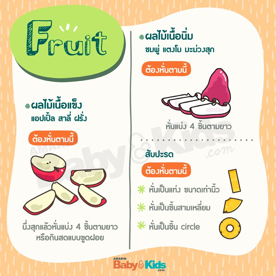 สำหรับผลไม้ที่ให้ลูกกินได้ก็มีหลายอย่าง ถ้าเป็นผลไม้เนื้อแข็งอย่าง แอ๊ปเปิ้ล ฝรั่ง ต้องนึ่งสุกก่อนแล้วถึงผ่าสี่หรือกินสดให้ได้ทั้งผล ให้ลูกงับได้ หรือขูดฝอยก่อนให้หยิบกิน .. ส่วนเนื้อผลไม้เนื้อนิ่ม ตัดแบ่งให้จับถนัดมือได้เลย