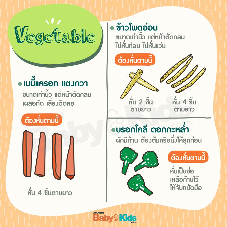 ส่วน ผักใบ เห็ด ลูกก็สามารถกินได้ เพียงหั่นให้ถูกวิธี และอาหารจำพวก ข้าวสวย เมล็ดข้าวโพดหวาน เมล็ดถั่วลันเตา ซึ่งมีขนาดเล็กกว่าหลอดลม คุณแม่ควรปล่อยให้ลูกจีบนิ้ว หยิบเข้าปากได้