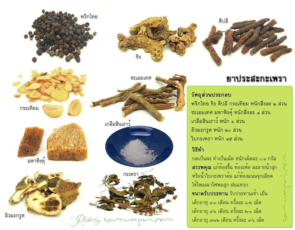 ยาประสะกะเพรา มีสรรพคุณ ช่วยขับลม แก้ท้องขึ้น ท้องเฟ้อ จุกเสียด แน่นท้อง เหมาะสำหรับ เด็กอายุตั้งแต่ 1 – 12 เดือน โดยรับประทานเช้า และเย็น แนะนำให้ใช้ชนิดผงหรือเม็ดลูกกลอน (เม็ดอัดเปียก) โดยนำไปละลายยากับน้ำต้มสุก หรือน้ำต้มใบกะเพรา ทิ้งให้ตกตะกอน แล้วดูดเฉพาะน้ำใสๆ เด็กอายุ 1 เดือน ครั้งละ 1 -2 เม็ด เด็กอายุ 4 – 6 เดือน ครั้งละ 2-3 เม็ด เด็กอายุ 7 – 12 เดือน ครั้งละ 4 – 6 เม็ด