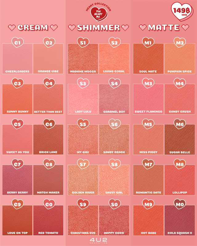 บลัชออน รุ่น YOU HEART ME รับประกันความพอใจ ด้วยเฉดสีเยอะมาก ถึง 30 เฉด แบ่งเป็น