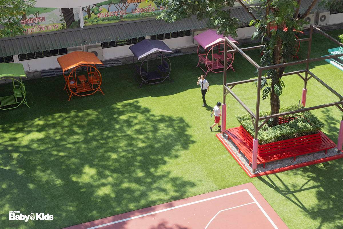 สนามใจกลางโรงเรียนเชื่อมระหว่างอาคารอนุบาล โรงอาหาร และอาคารประถม