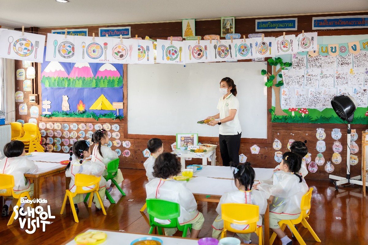 และเมื่อเราถามว่าที่ให้เล่นนั้น คือ ให้เล่นขนาดไหน ครูขิมจึงพาเราเดินชมโรงเรียนที่เด็ก ๆ กำลังทำกิจกรรมอาหารดีมีประโยชน์ ในหน่วยการเรียนรู้ “อาหาร” ประจำภาคเรียน ซึ่งเด็ก ๆ ทุกห้องกำลังลงมือเล่นอาหารอย่างเอิกเกริกที่สุด