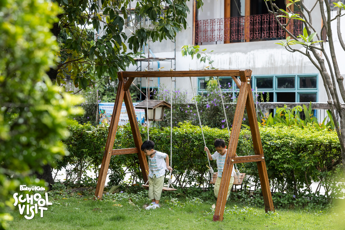 4 พื้นที่สีเขียว ที่ถึงแม้พื้นที่จะดูเล็กแต่ที่นี่มีต้นไม้มาก โรงเรียนเน้นให้เด็กๆ อยู่กับธรรมชาติ เรียนรู้ผ่านธรรมชาติ ก้อนหิน ต้นไม้ ดอกไม้ ที่เขาได้เห็น มันจะช่วยเรื่องสุนทรียศาสตร์ทางด้านอารมณ์ของเด็กๆ ด้วย