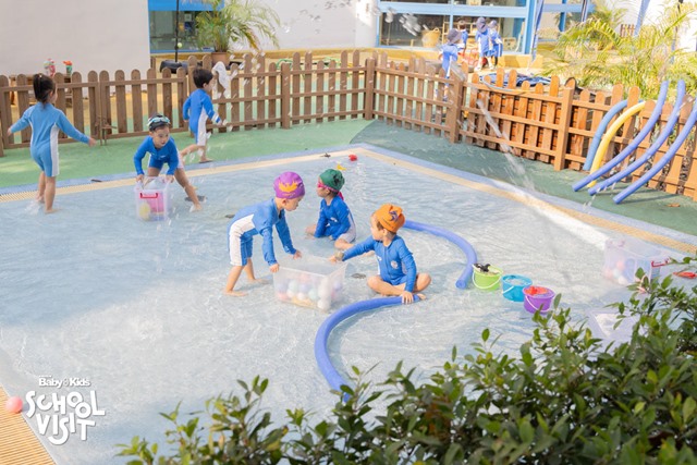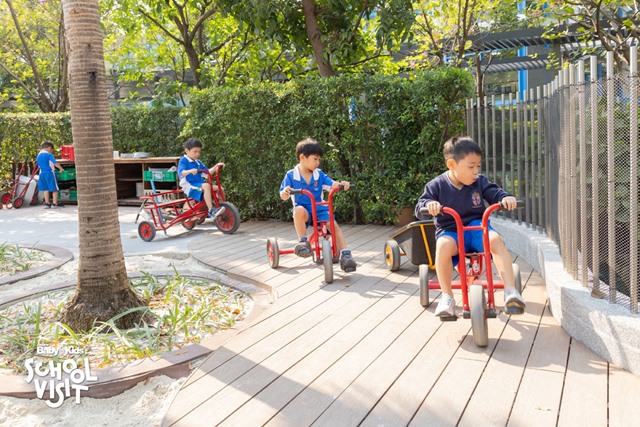 ฐานกิจกรรมด้านนอกที่เชื่อมต่อกับอาคารเรียน มีให้เลือกมากมาย เช่น ขี่จักรยานสามล้อ เล่นทราย เล่นน้ำ (Splash Pool)