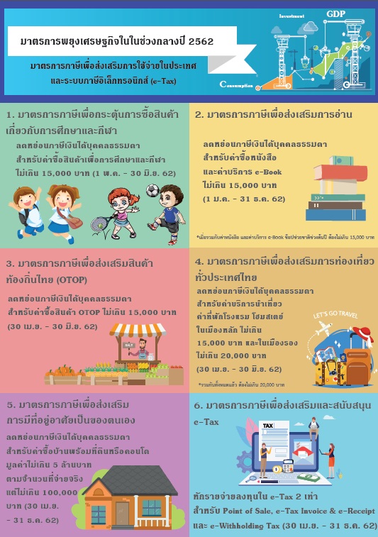 • ค่าลดหย่อนภาษีเพื่อการศึกษาและกีฬาค่าลดหย่อนภาษีเพื่อการศึกษาและกีฬา และมาตราการอื่นๆ เพื่อลดภาระจากรัฐบาล